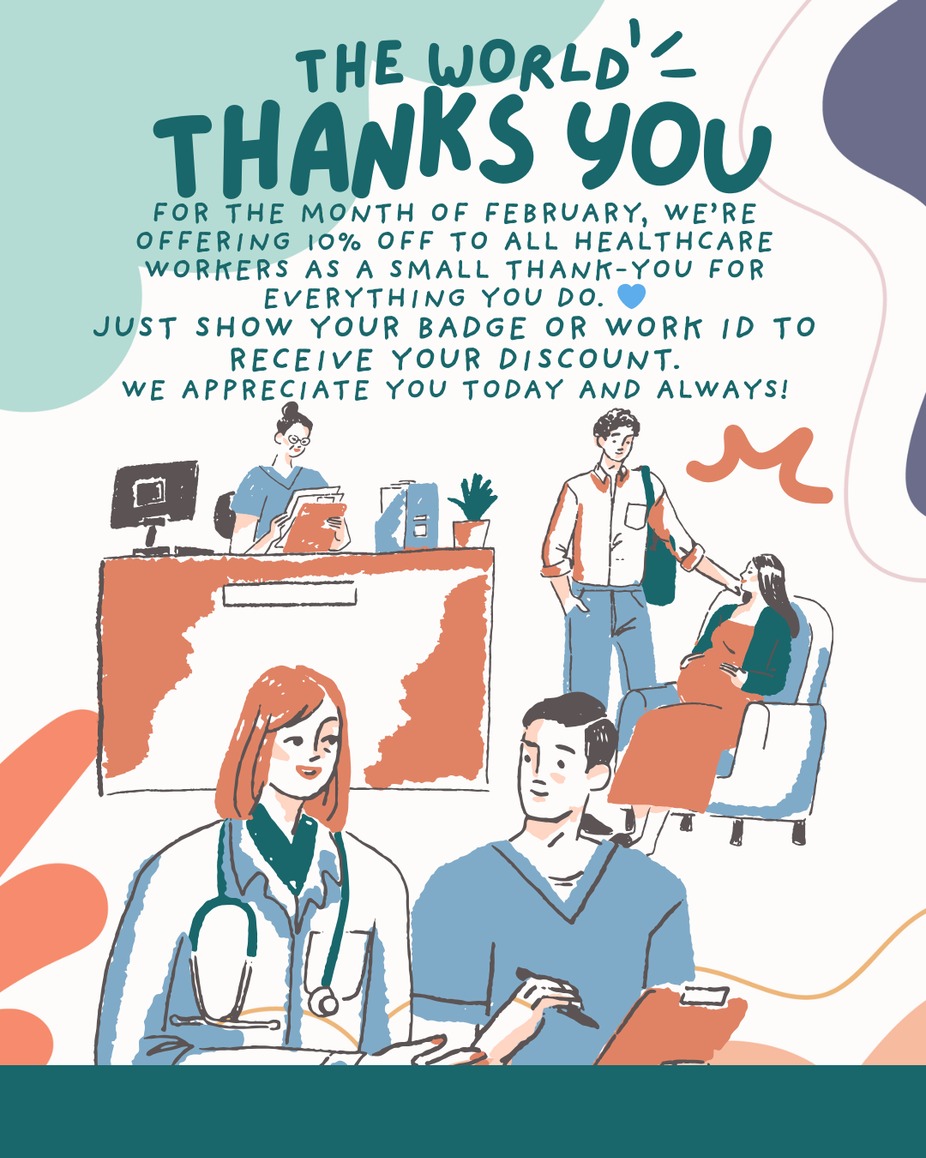 For the month of February, we’re offering 10% off to all healthcare workers as a small thank-you for everything you do. 💙